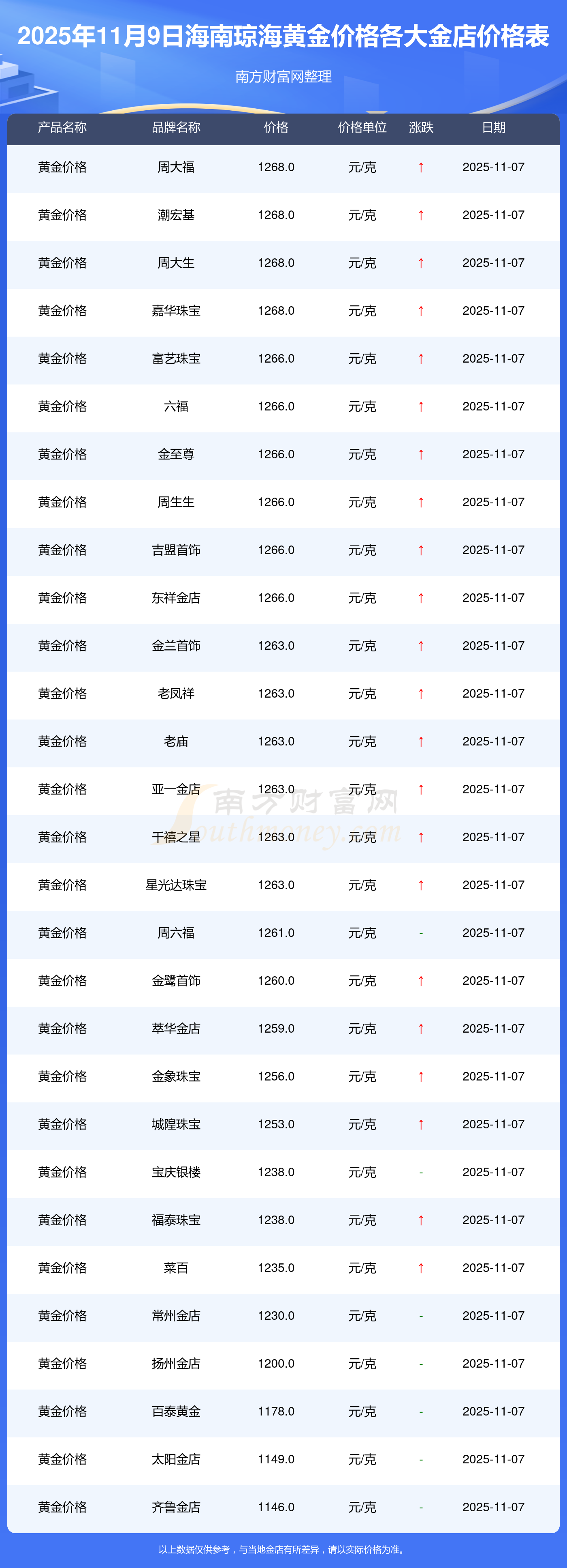 今天是2025年11月9日,海南瓊海寶泉錢幣、金蘭首飾、金蘭首飾、謝瑞麟、謝瑞麟、謝瑞麟、謝瑞麟、謝瑞麟、金銀街、金銀街、金銀街等各大金店品牌黃金價(jià)格最新價(jià)格行情是這樣的:寶泉錢幣11.4元/克、金蘭首飾1263.0元/克、金蘭首飾560.0元/克、謝瑞麟1202.0元/克、謝瑞麟1268.0元/克、謝瑞麟44260.0、謝瑞麟13080.0、謝瑞麟39960.0、金銀街1243.0元/克、金銀街1258.0元/克、金銀街1248.0元/克。