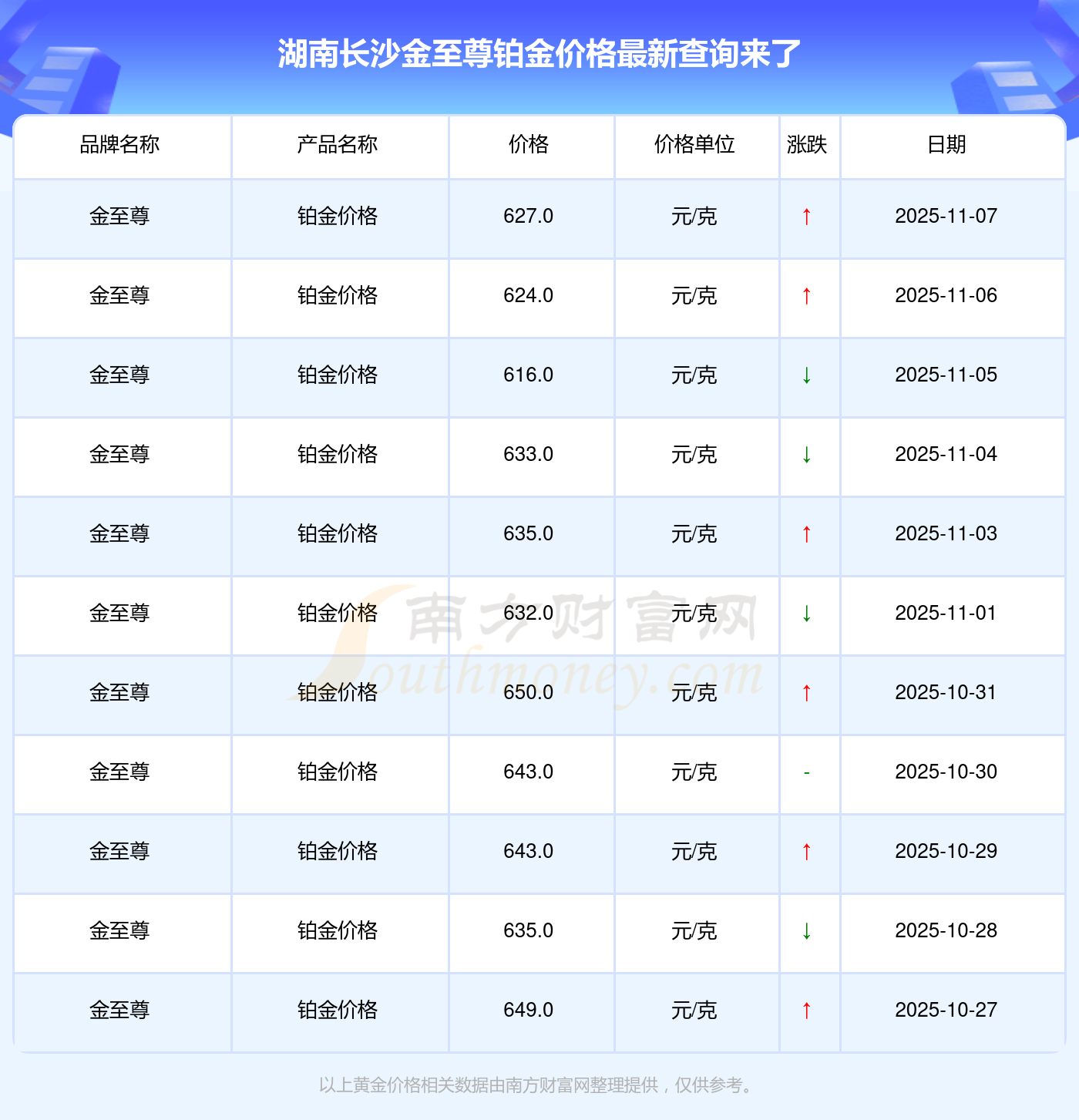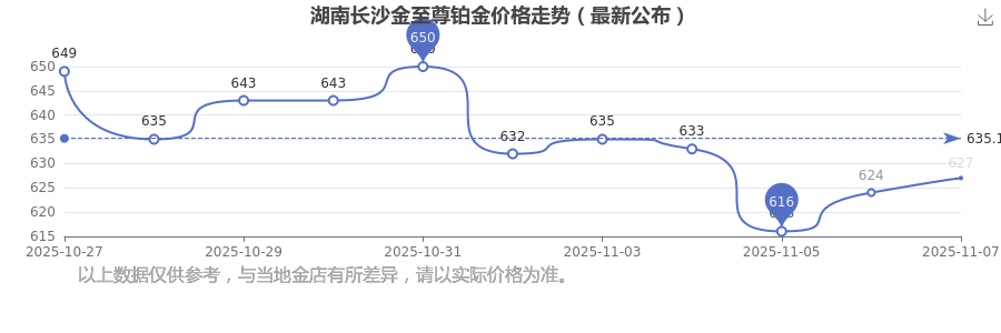 2025年11月9日,湖南長(zhǎng)沙金至尊鉑金價(jià)格每克的價(jià)值量定格在627.0元/克。