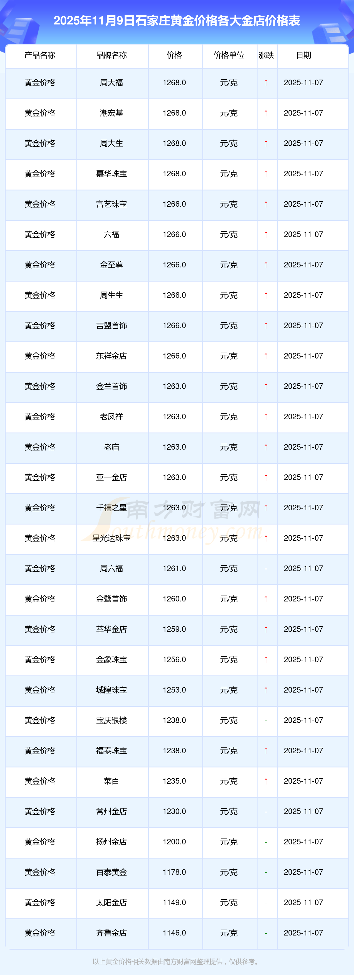 今天是2025年11月9日,石家莊寶泉錢幣、金蘭首飾、金蘭首飾、謝瑞麟、謝瑞麟、謝瑞麟、謝瑞麟、謝瑞麟、金銀街、金銀街、金銀街等各大金店品牌黃金價(jià)格最新價(jià)格如下:寶泉錢幣11.4元/克、金蘭首飾1263.0元/克、金蘭首飾560.0元/克、謝瑞麟1202.0元/克、謝瑞麟1268.0元/克、謝瑞麟44260.0、謝瑞麟13080.0、謝瑞麟39960.0、金銀街1243.0元/克、金銀街1258.0元/克、金銀街1248.0元/克。