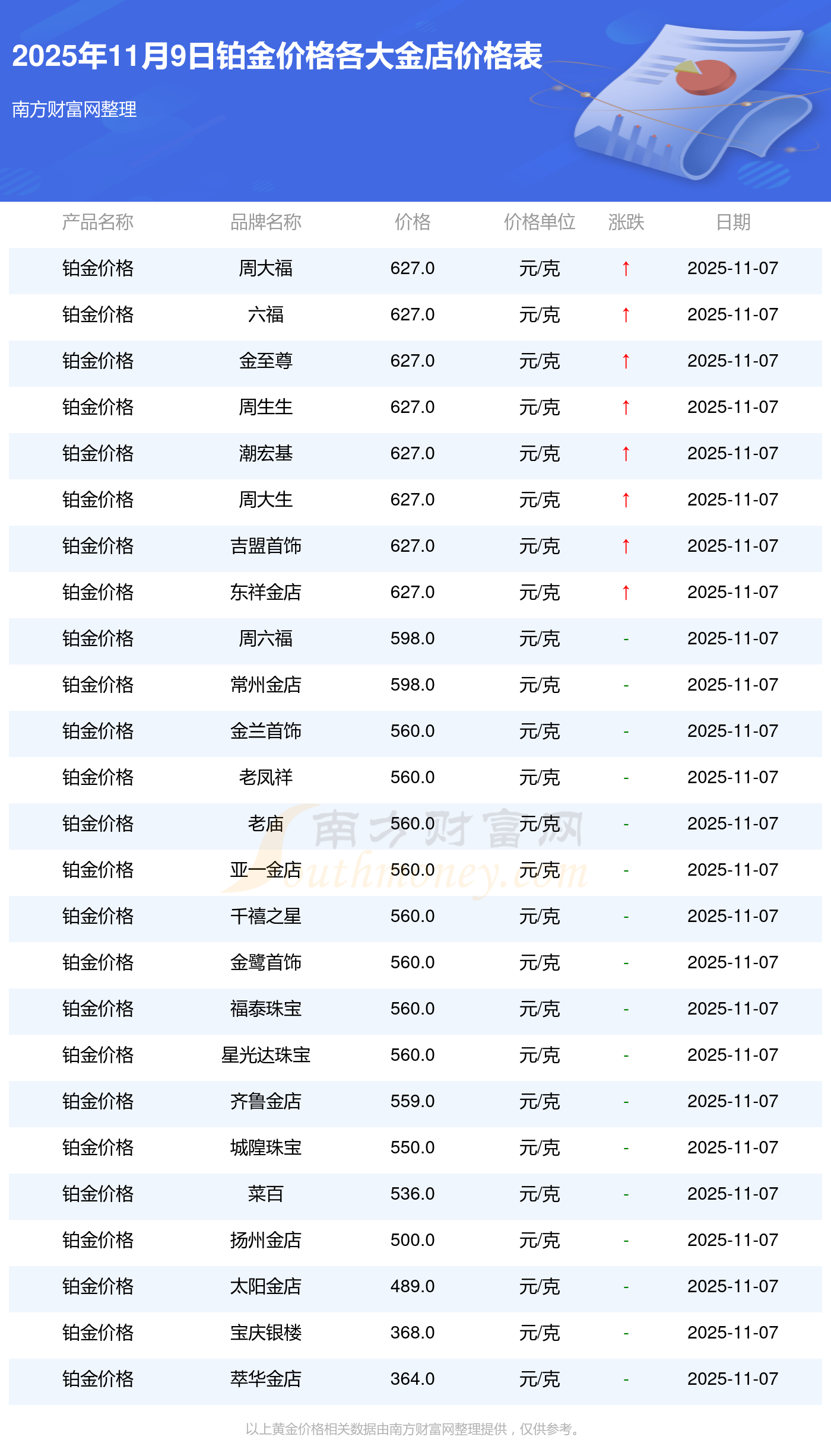 2025年11月9日各大金店鉑金價(jià)格最新價(jià)格:寶泉錢幣11.4元/克,金蘭首飾1263.0元/克,金蘭首飾560.0元/克,謝瑞麟1202.0元/克,謝瑞麟1268.0元/克,謝瑞麟44260.0,謝瑞麟13080.0,謝瑞麟39960.0,金銀街1243.0元/克,金銀街1258.0元/克,金銀街1248.0元/克。