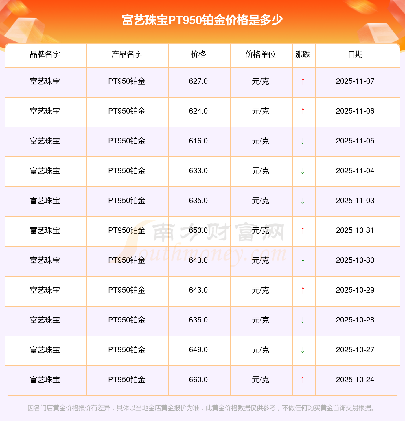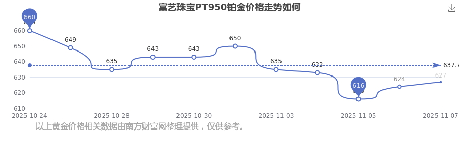2025年11月9日富藝珠寶PT950鉑金價格:627.0元/克。
