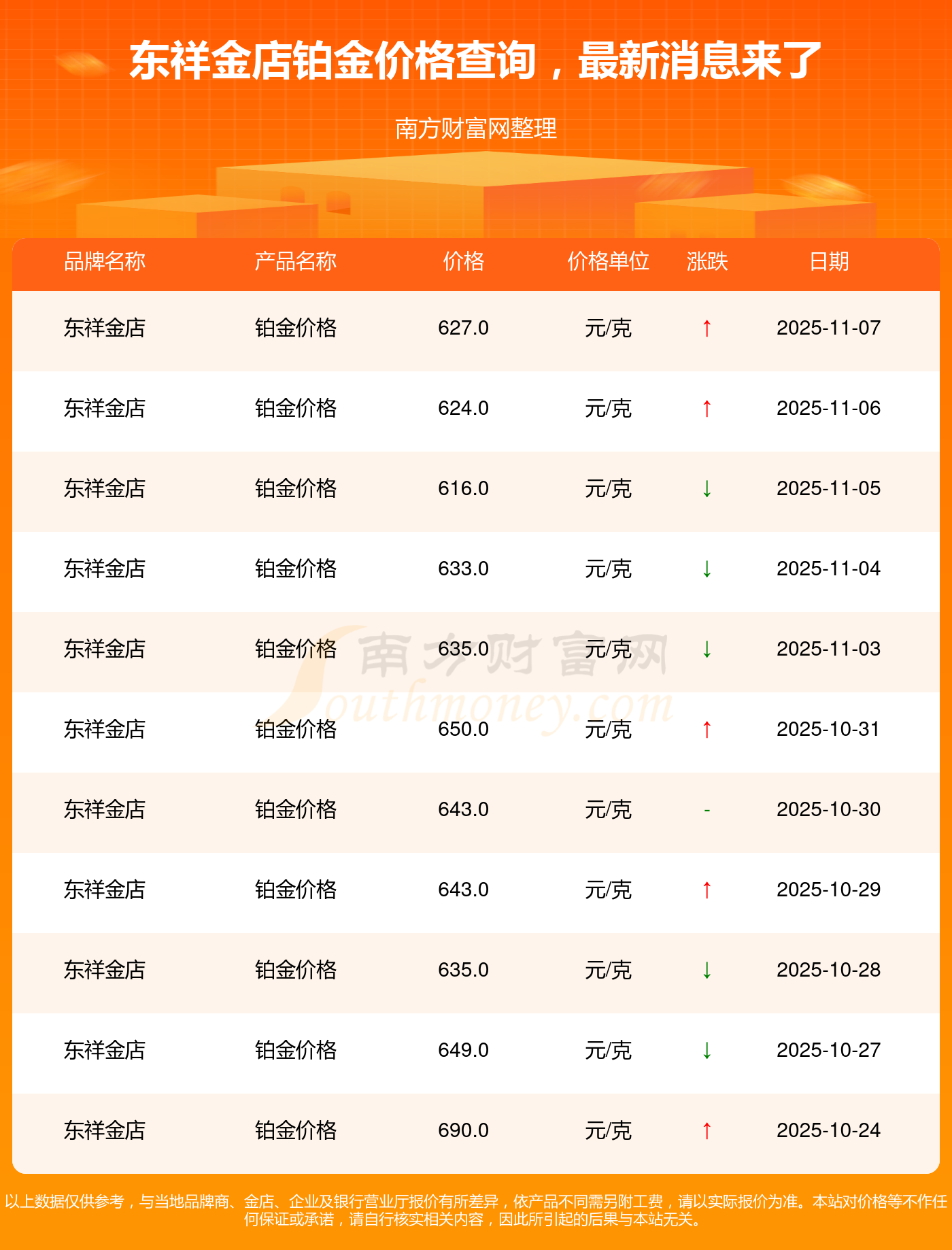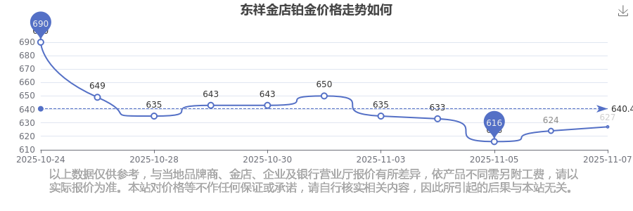 東祥金店今日鉑金價格的最新市場行情價為627.0元/克。