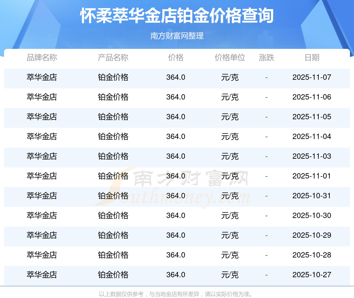 ??柔萃華金店在 2025年11月9日的鉑金價(jià)格零售價(jià)格為 364.0元/克。