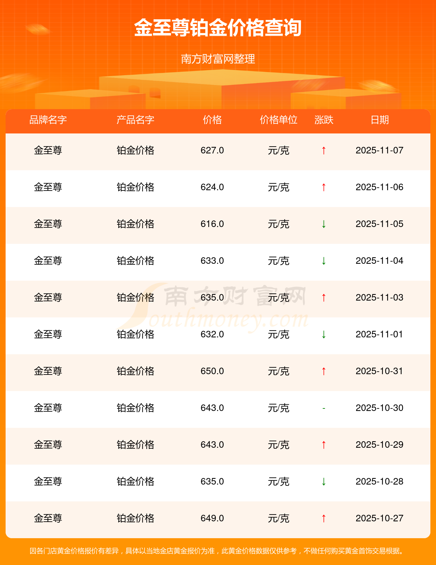 2025年11月9日金至尊鉑金價(jià)格查詢:627.0元/克。
