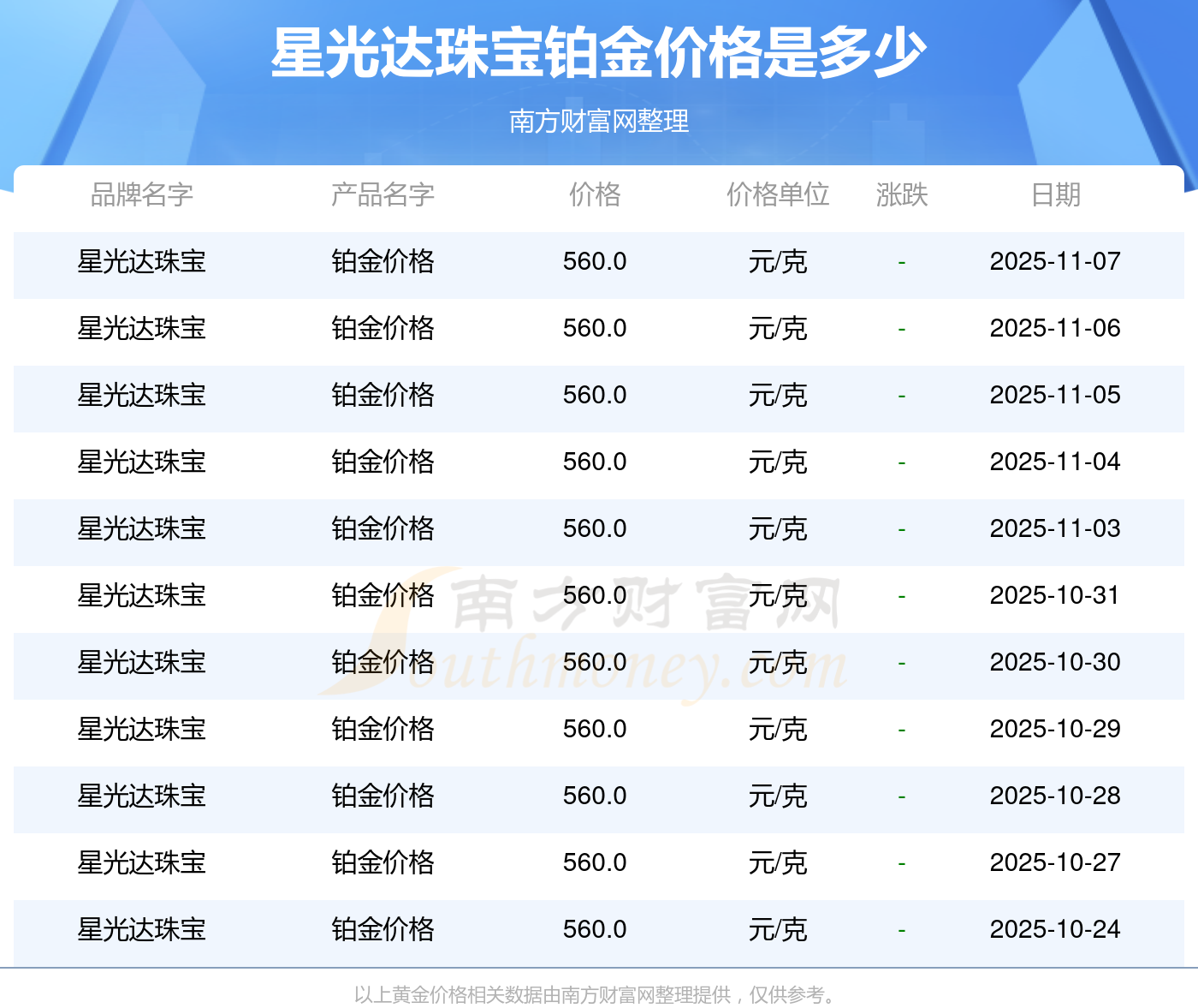 今日星光達珠寶鉑金價格的價格是560.0元/克。