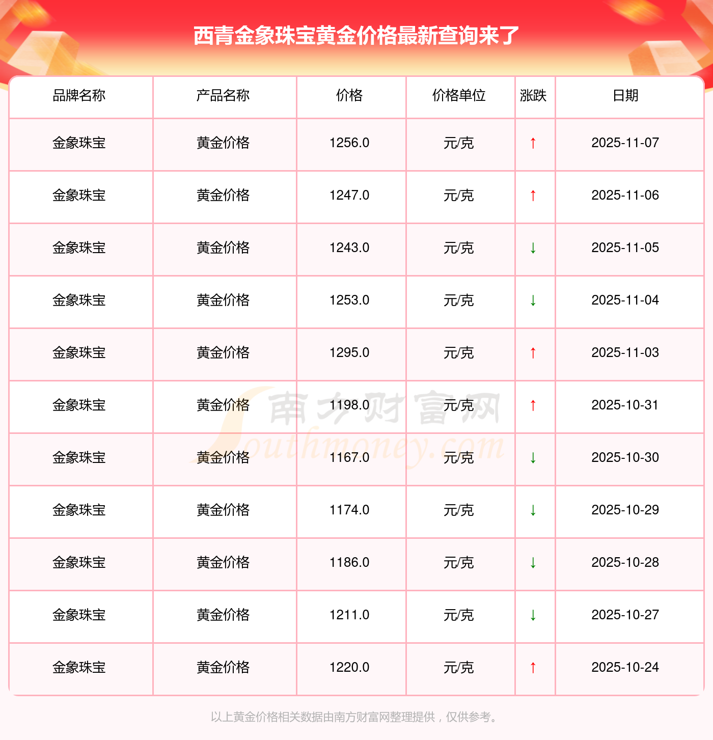 (2025年11月9日)今日西青金象珠寶黃金價格是1256.0元/克。