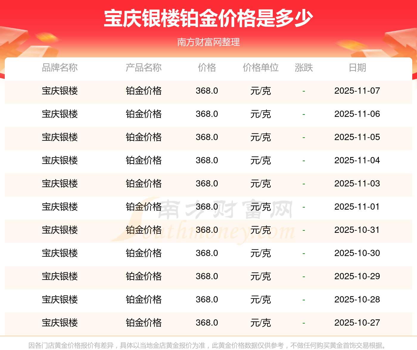 目前寶慶銀樓 鉑金價格的價格,今日最新為368.0元/克。