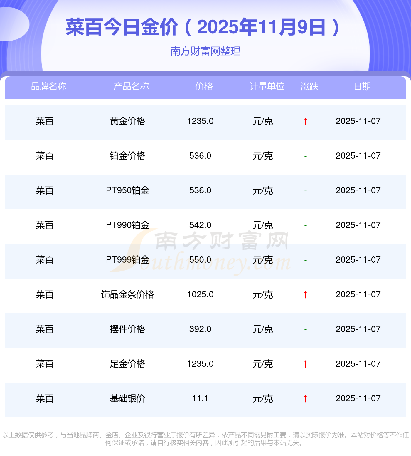 菜百金價今日價格:銀條價格11.4元/克,黃金價格1263.0元/克,鉑金價格560.0元/克,金條價格(內(nèi)地)1202.0元/克,金飾價格(內(nèi)地)1268.0元/克,黃金飾品(香港)44260.0,鉑金飾品(香港)13080.0,金條金價(香港)39960.0,投資金條1243.0元/克,工藝金條1258.0元/克,千足金首飾1248.0元/克。