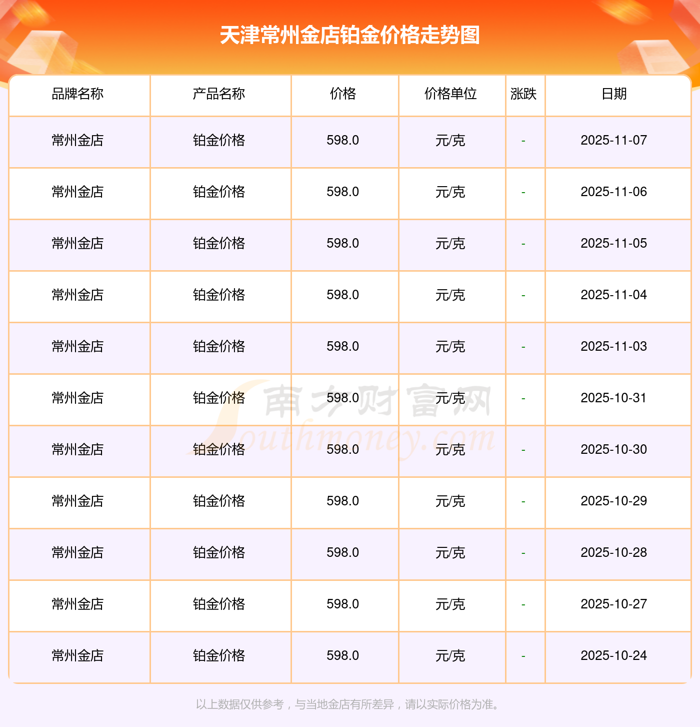 今日天津常州金店鉑金價(jià)格是598.0元/克。