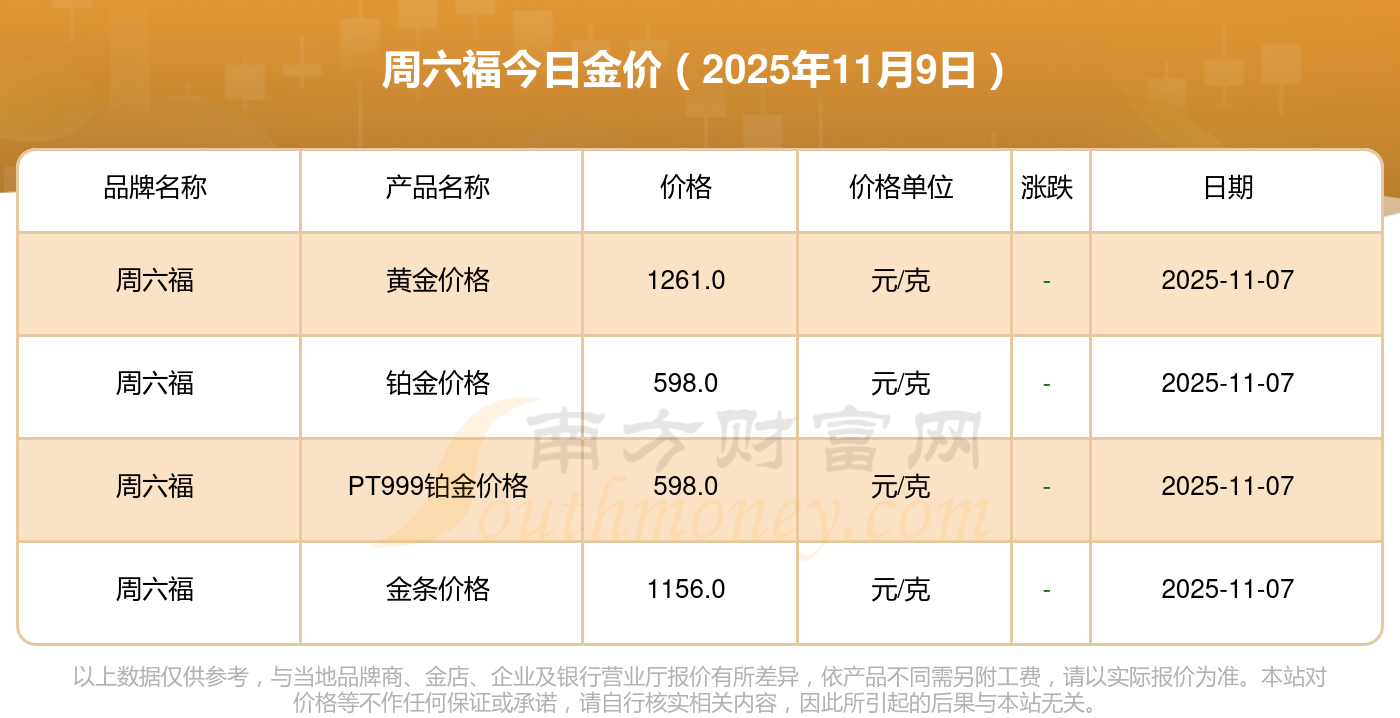 今天是2025年11月9日,寶泉錢幣、金蘭首飾、金蘭首飾、謝瑞麟、謝瑞麟、謝瑞麟、謝瑞麟、謝瑞麟、金銀街、金銀街、金銀街等各大金店品牌黃金價格最新價格如下:寶泉錢幣11.4元/克、金蘭首飾1263.0元/克、金蘭首飾560.0元/克、謝瑞麟1202.0元/克、謝瑞麟1268.0元/克、謝瑞麟44260.0、謝瑞麟13080.0、謝瑞麟39960.0、金銀街1243.0元/克、金銀街1258.0元/克、金銀街1248.0元/克。