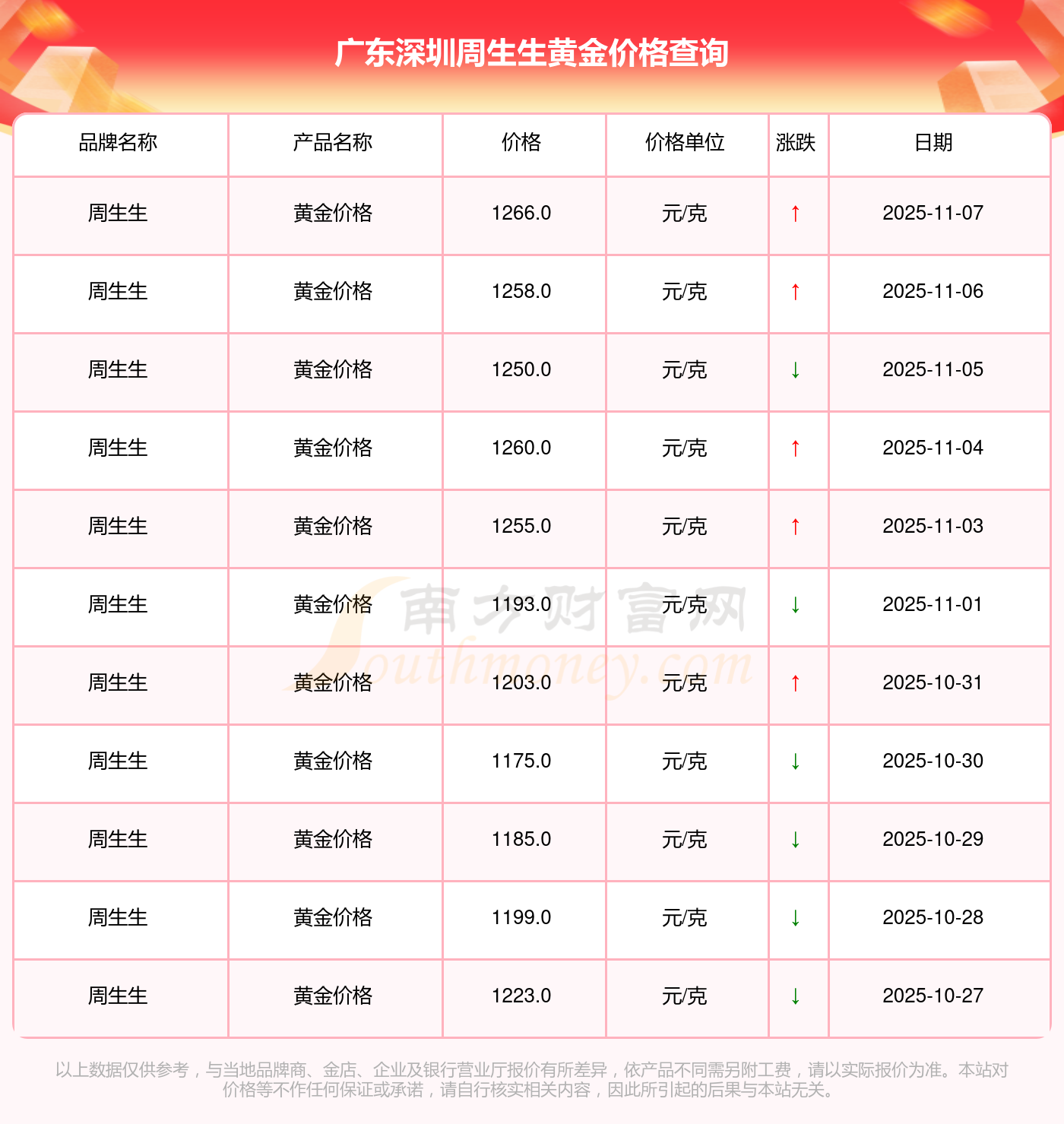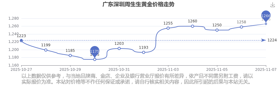 今日(2025年11月9日)廣東深圳周生生黃金價(jià)格:1266.0元/克。