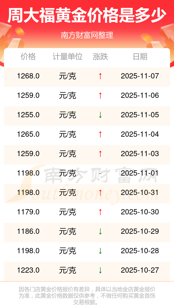 今日(2025年11月9日),周大福黃金價(jià)格最新價(jià)格為1268.0元/克。