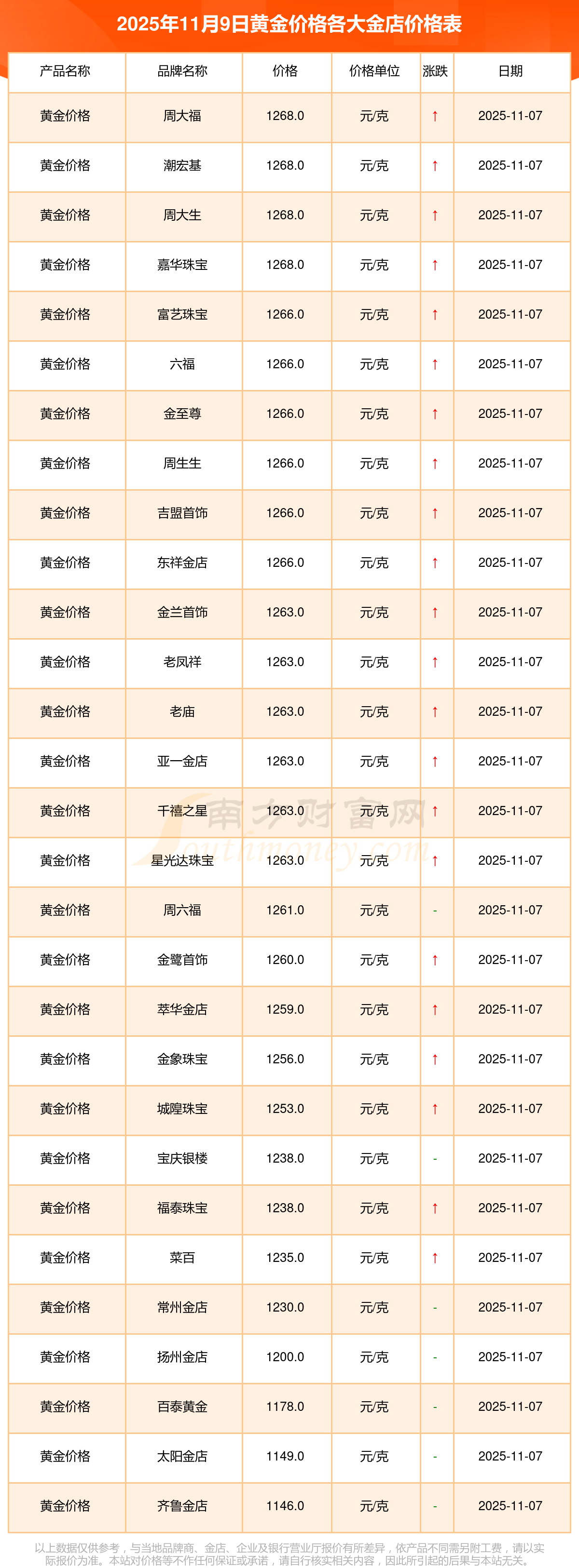 2025年11月9日各大金店黃金價格最新價格:寶泉錢幣11.4元/克,金蘭首飾1263.0元/克,金蘭首飾560.0元/克,謝瑞麟1202.0元/克,謝瑞麟1268.0元/克,謝瑞麟44260.0,謝瑞麟13080.0,謝瑞麟39960.0,金銀街1243.0元/克,金銀街1258.0元/克,金銀街1248.0元/克。