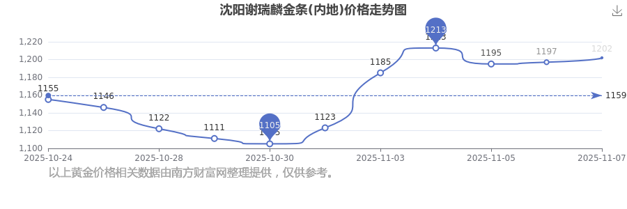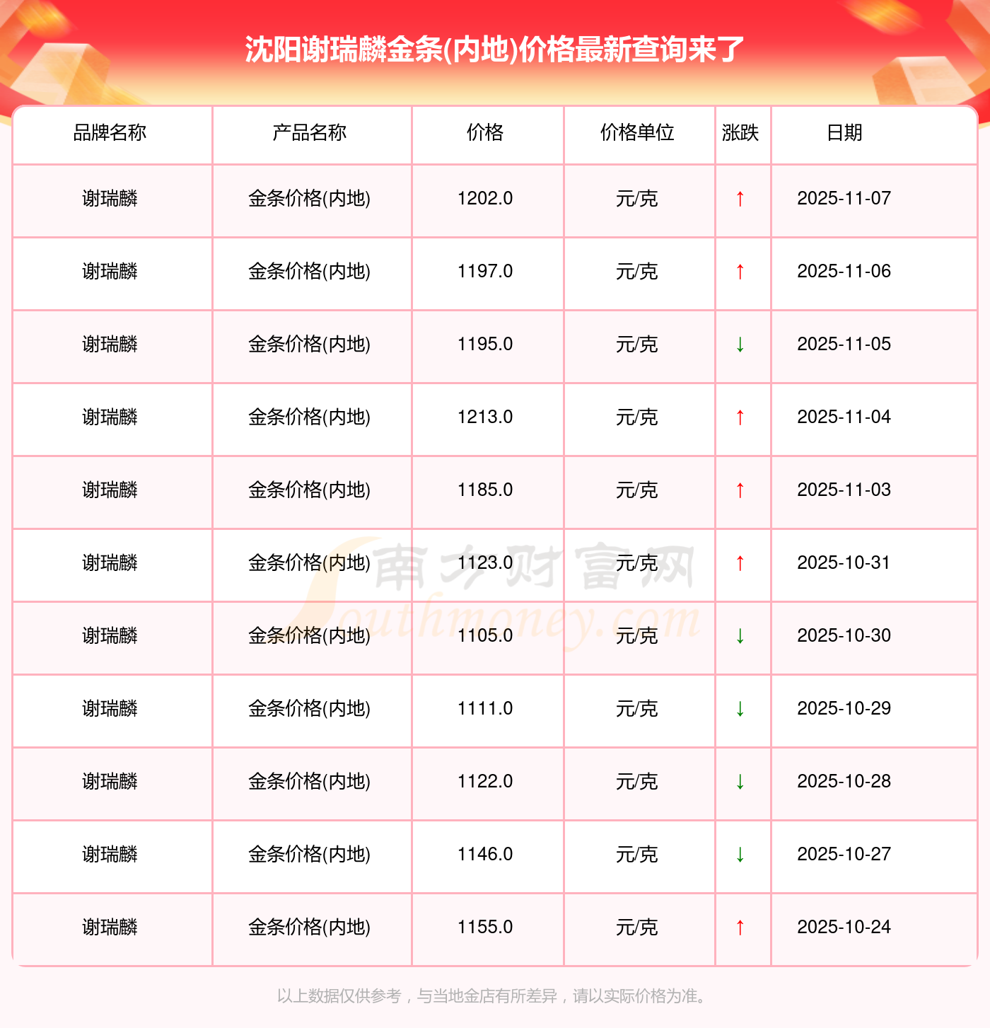 今日(2025年11月9日),沈陽謝瑞麟金條價格(內(nèi)地)的定價為 1202.0元/克。
