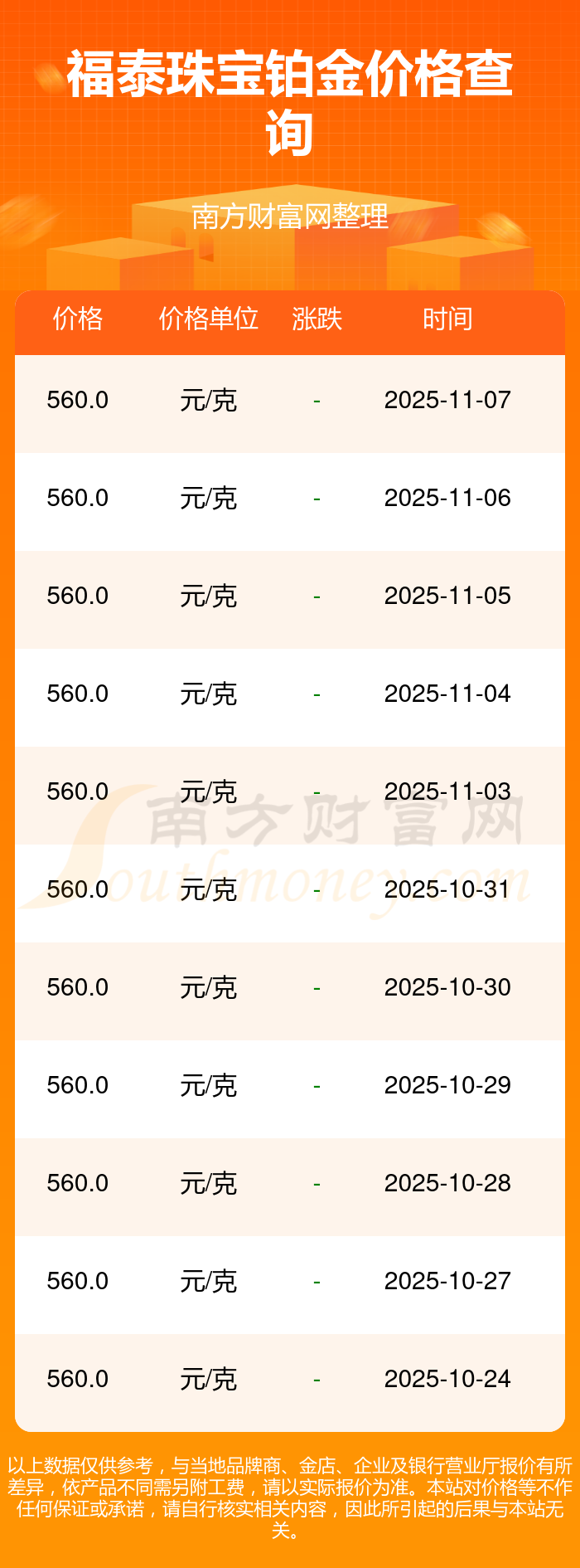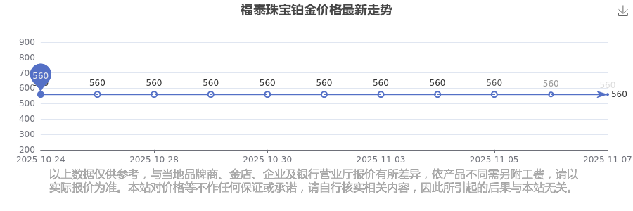 據了解,今日福泰珠寶 鉑金價格的最新價格為560.0元/克。