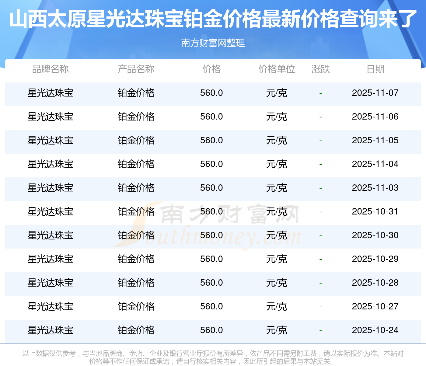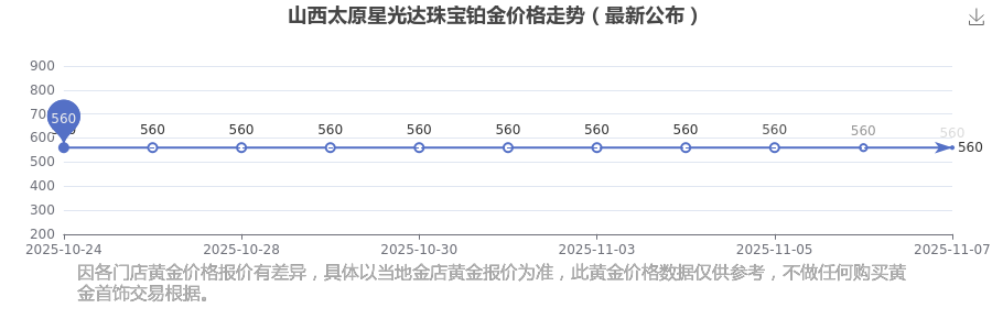 2025年11月9日山西太原星光達(dá)珠寶鉑金價(jià)格:560.0元/克。