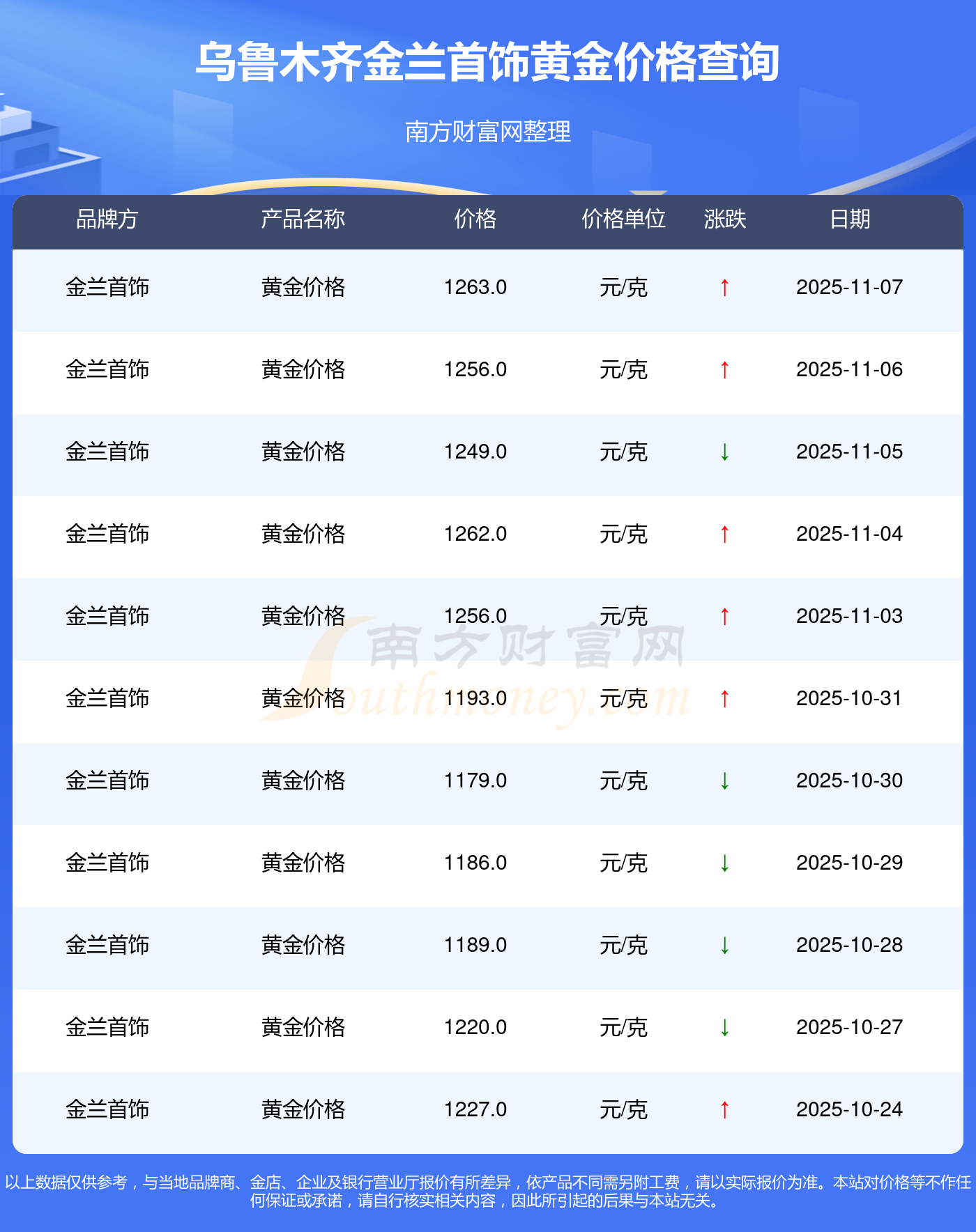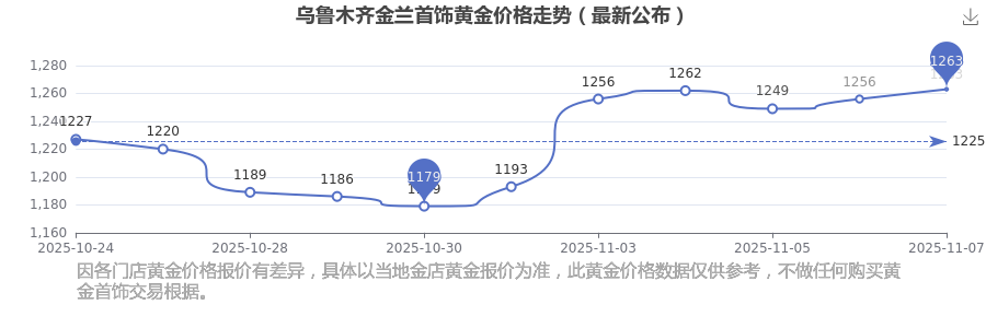 今日(2025年11月9日)烏魯木齊金蘭首飾黃金價(jià)格:1263.0元/克。