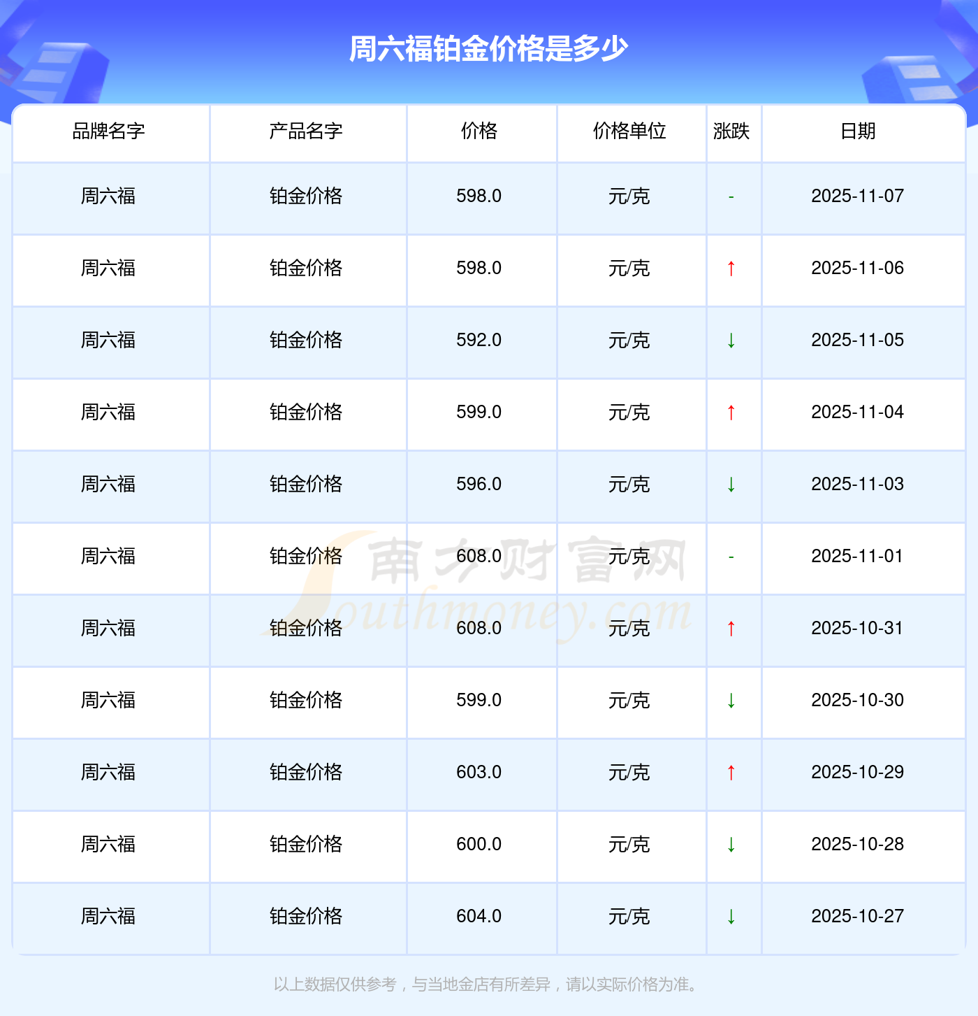 據(jù)了解,今日周六福 鉑金價格的最新價格為598.0元/克。