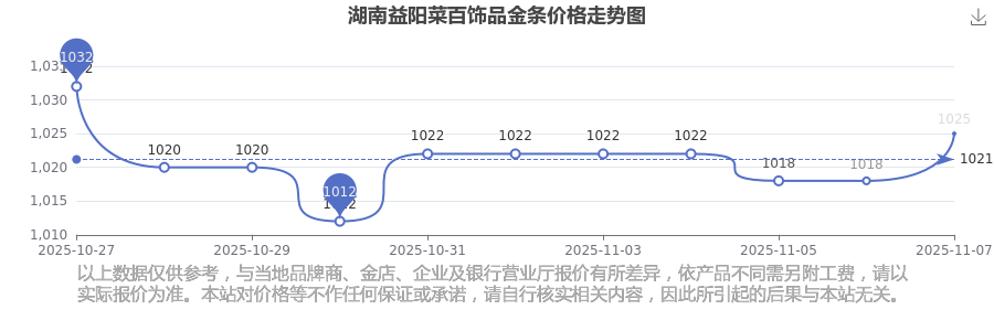 2025年11月9日,今日湖南益陽(yáng)菜百飾品金條價(jià)格:1025.0元/克。