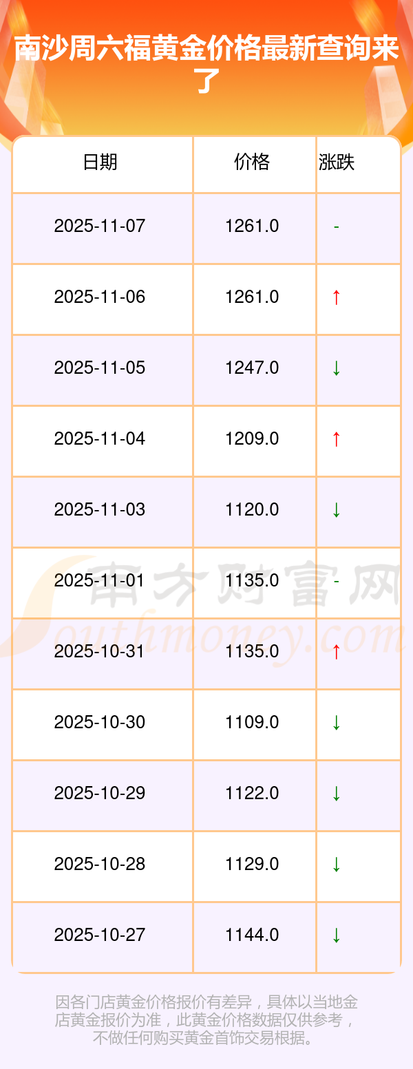 于 2025年11月9日,南沙周六福黃金價(jià)格的克價(jià)為1261.0元/克。