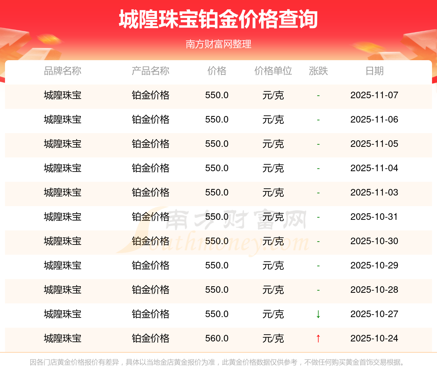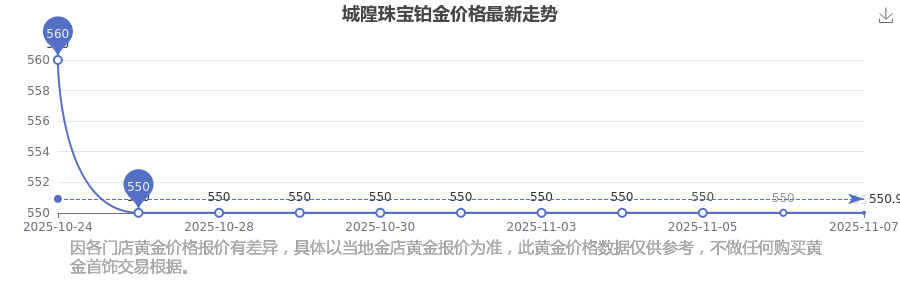 今日城隍珠寶鉑金價(jià)格最新價(jià)格為550.0元/克。