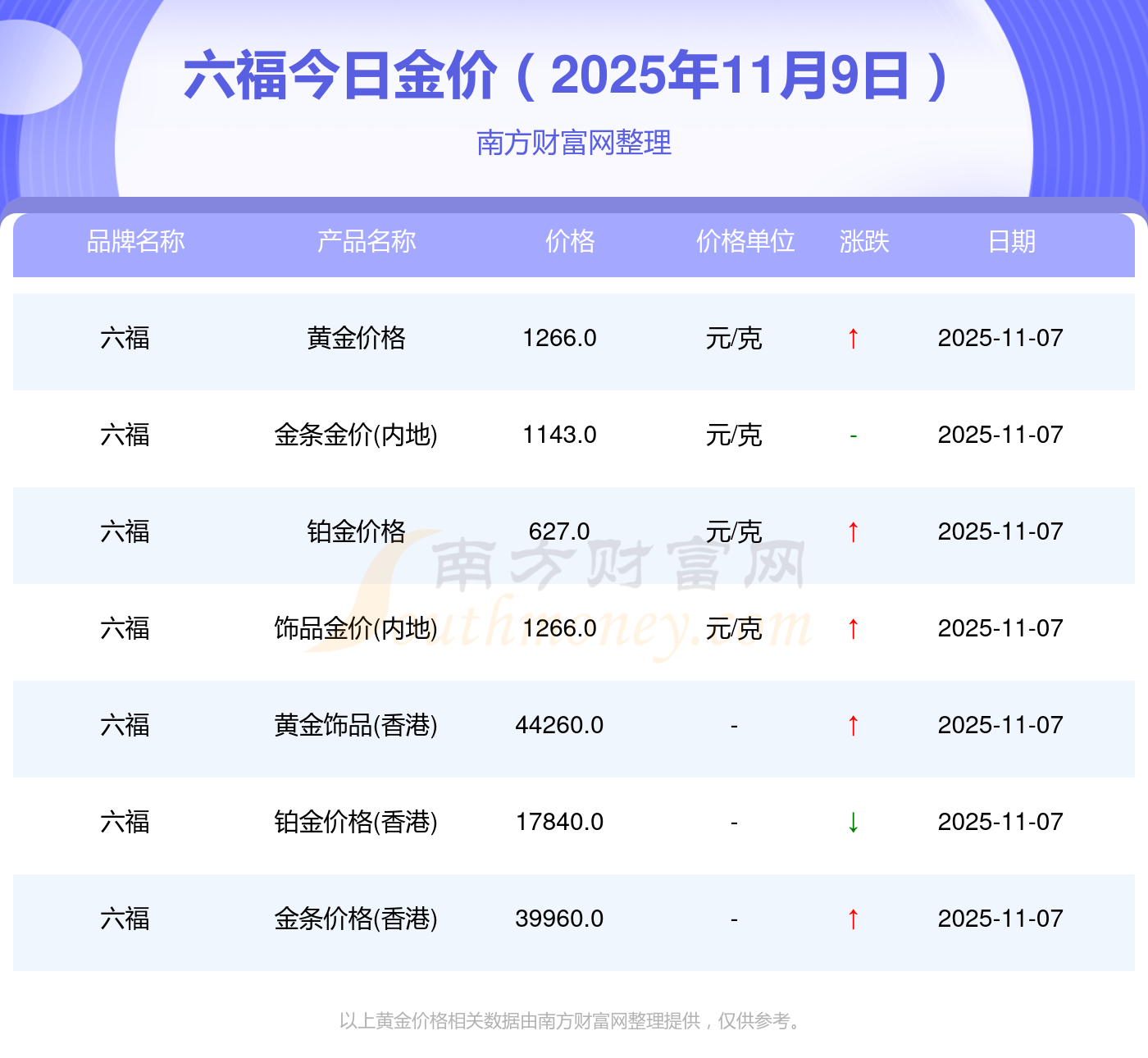 2025年11月9日六福金價查詢:銀條價格11.4元/克,黃金價格1263.0元/克,鉑金價格560.0元/克,金條價格(內(nèi)地)1202.0元/克,金飾價格(內(nèi)地)1268.0元/克,黃金飾品(香港)44260.0,鉑金飾品(香港)13080.0,金條金價(香港)39960.0,投資金條1243.0元/克,工藝金條1258.0元/克,千足金首飾1248.0元/克。