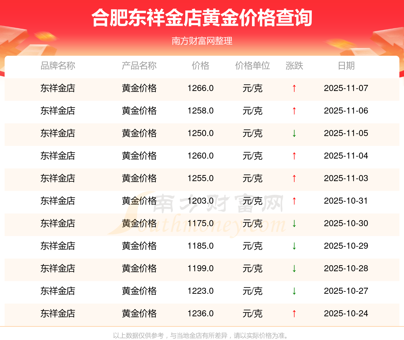 (2025年11月9日)合肥東祥金店黃金價格現在為1266.0元/克。