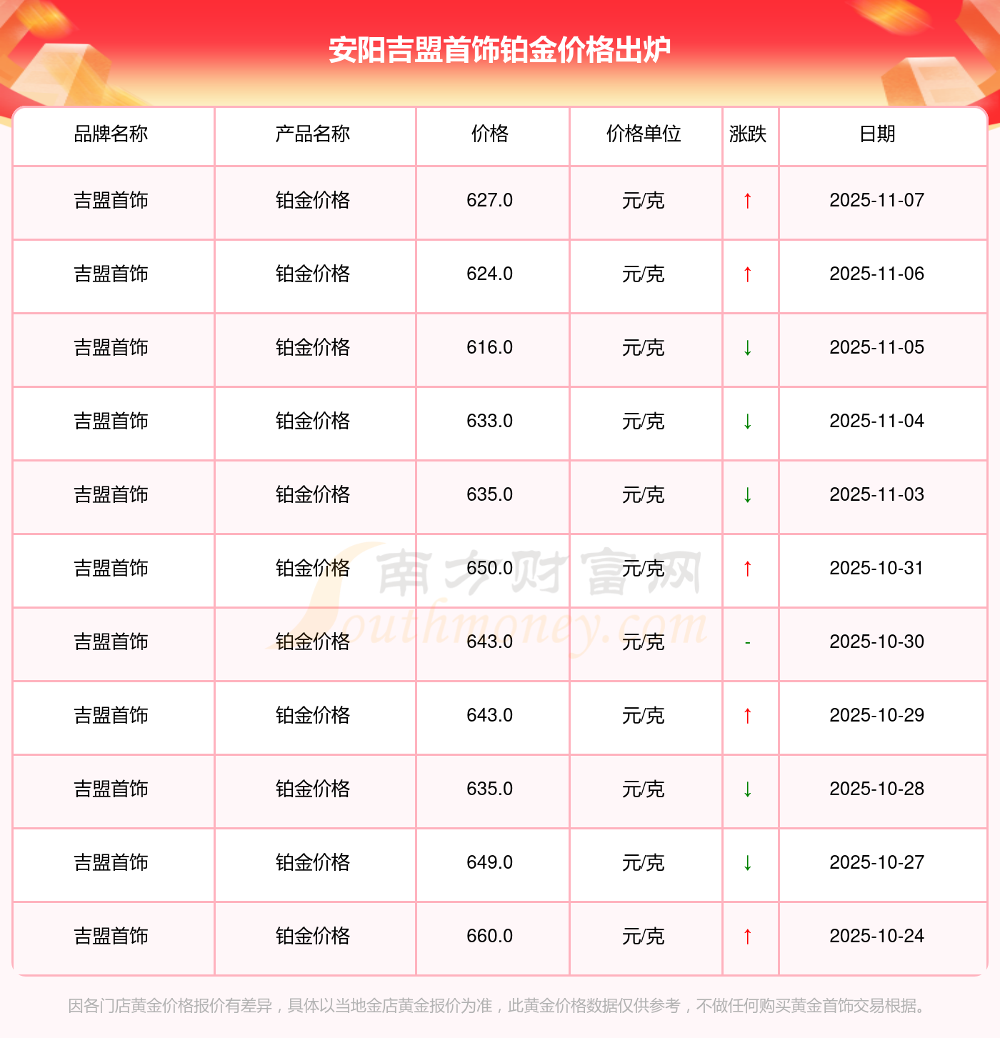 2025年11月9日,寶泉錢幣、金蘭首飾、金蘭首飾、謝瑞麟、謝瑞麟、謝瑞麟、謝瑞麟、謝瑞麟、金銀街、金銀街、金銀街等各大金店品牌鉑金價格今日價格如下:寶泉錢幣11.4元/克、金蘭首飾1263.0元/克、金蘭首飾560.0元/克、謝瑞麟1202.0元/克、謝瑞麟1268.0元/克、謝瑞麟44260.0、謝瑞麟13080.0、謝瑞麟39960.0、金銀街1243.0元/克、金銀街1258.0元/克、金銀街1248.0元/克。
