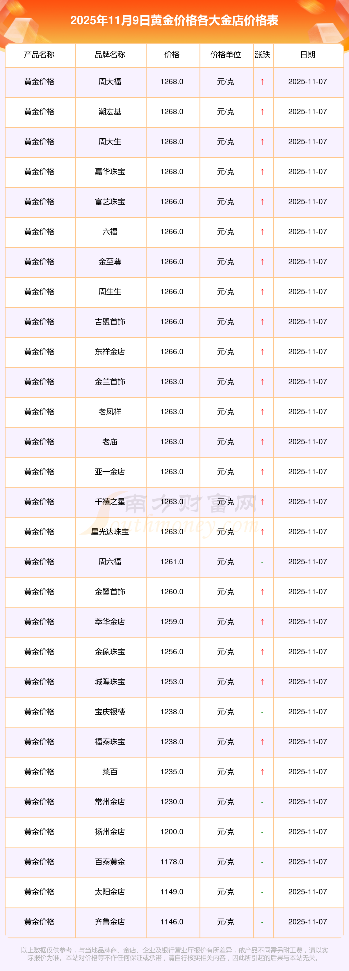 2025年11月9日各大金店黃金價(jià)格最新價(jià)格:寶泉錢幣11.4元/克,金蘭首飾1263.0元/克,金蘭首飾560.0元/克,謝瑞麟1202.0元/克,謝瑞麟1268.0元/克,謝瑞麟44260.0,謝瑞麟13080.0,謝瑞麟39960.0,金銀街1243.0元/克,金銀街1258.0元/克,金銀街1248.0元/克。