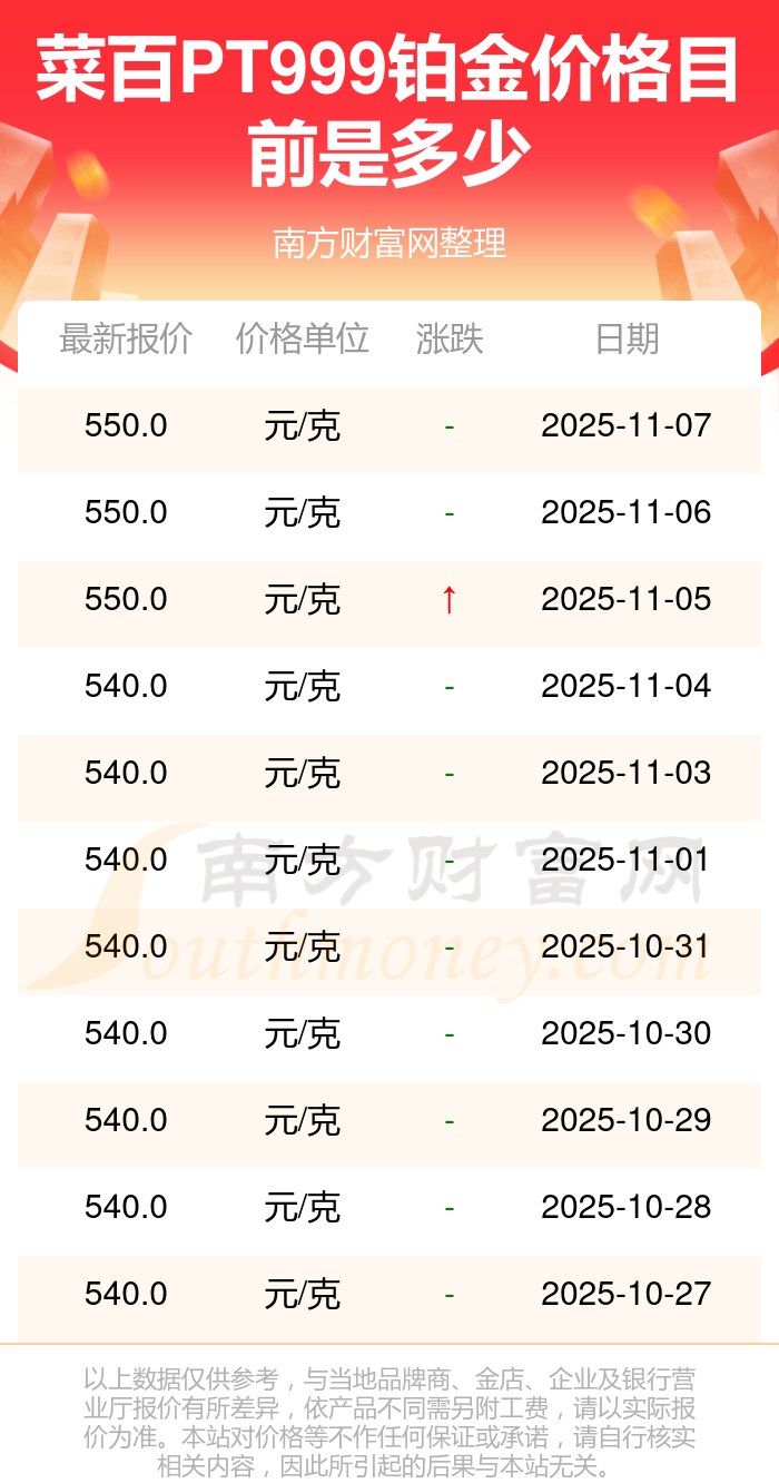 今日菜百PT999鉑金價(jià)格:550.0元/克。