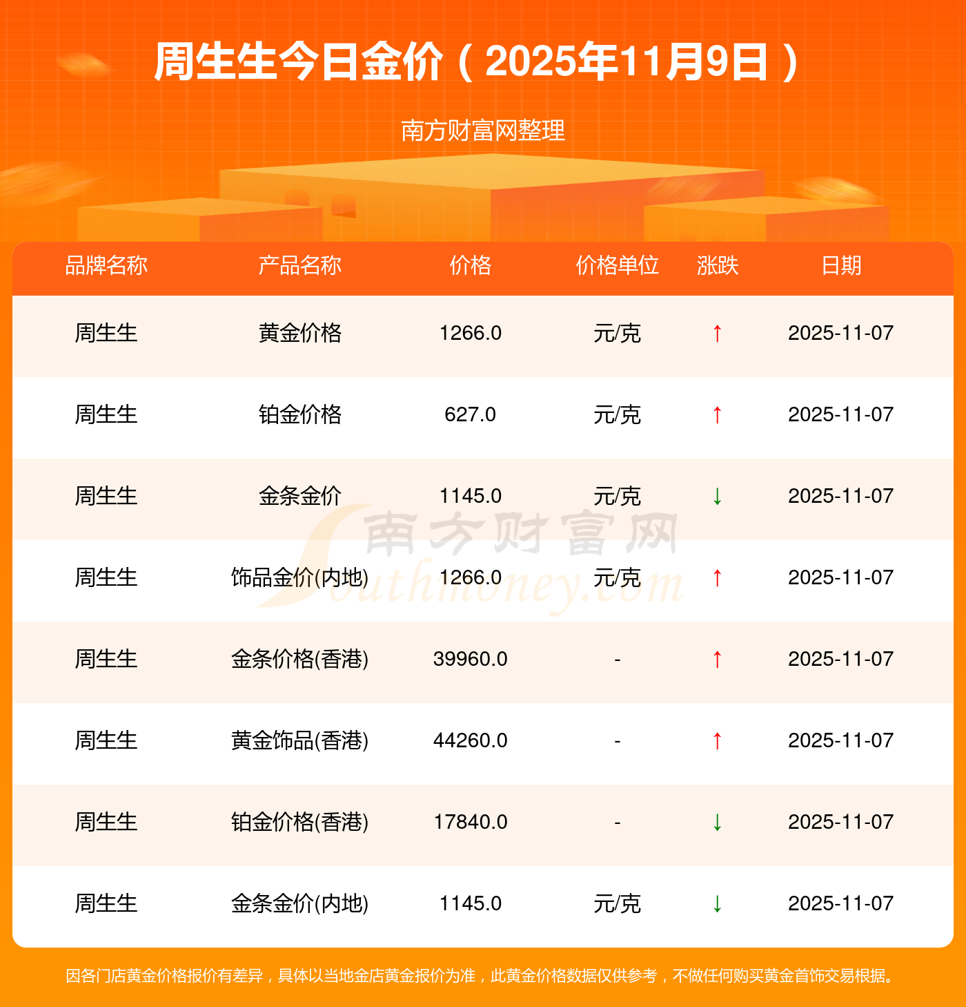 2025年11月9日周生生今日價格:銀條價格11.4元/克,黃金價格1263.0元/克,鉑金價格560.0元/克,金條價格(內(nèi)地)1202.0元/克,金飾價格(內(nèi)地)1268.0元/克,黃金飾品(香港)44260.0,鉑金飾品(香港)13080.0,金條金價(香港)39960.0,投資金條1243.0元/克,工藝金條1258.0元/克,千足金首飾1248.0元/克。