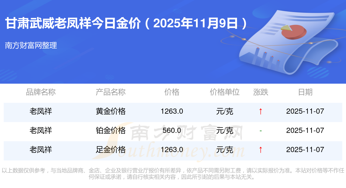 今日黃金價格具體多少?當下每克黃金值多少錢呢?2025年11月9日甘肅武威老鳳祥今日價格:銀條價格11.4元/克,黃金價格1263.0元/克,鉑金價格560.0元/克,金條價格(內(nèi)地)1202.0元/克,金飾價格(內(nèi)地)1268.0元/克,黃金飾品(香港)44260.0,鉑金飾品(香港)13080.0,金條金價(香港)39960.0,投資金條1243.0元/克,工藝金條1258.0元/克,千足金首飾1248.0元/克。