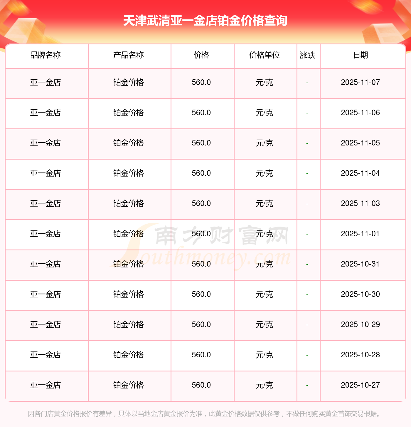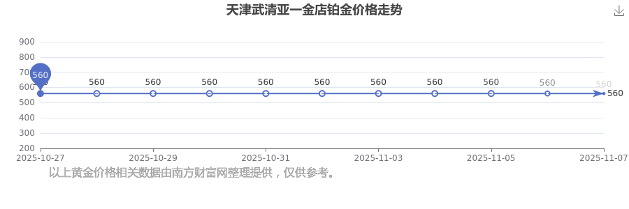 今日(2025年11月9日)天津武清亞一金店鉑金價(jià)格最新價(jià)格為560.0元/克。