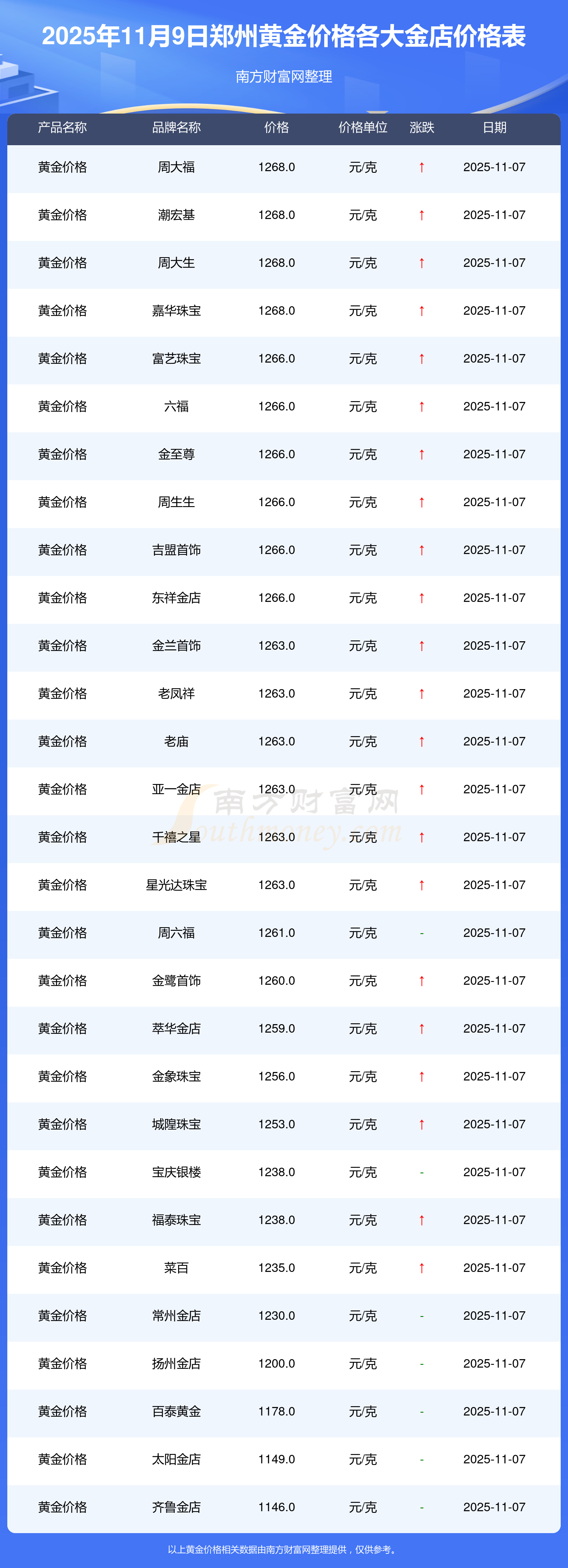 2025年11月9日鄭州各大金店黃金價(jià)格最新價(jià)格查詢(xún)來(lái)了:寶泉錢(qián)幣11.4元/克,金蘭首飾1263.0元/克,金蘭首飾560.0元/克,謝瑞麟1202.0元/克,謝瑞麟1268.0元/克,謝瑞麟44260.0,謝瑞麟13080.0,謝瑞麟39960.0,金銀街1243.0元/克,金銀街1258.0元/克,金銀街1248.0元/克。
