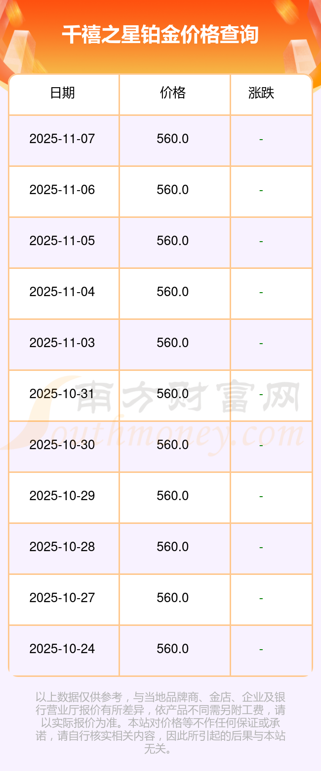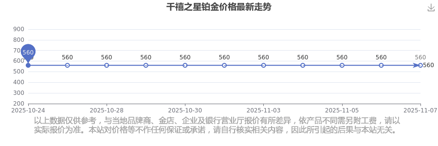 2025年11月9日千禧之星鉑金價格查詢:560.0元/克。