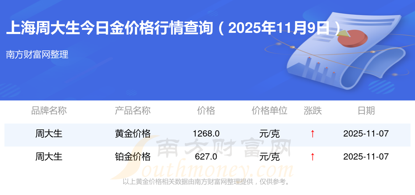2025年11月9日上海周大生一克黃金對(duì)應(yīng)的價(jià)格是多少?銀條價(jià)格11.4元/克,黃金價(jià)格1263.0元/克,鉑金價(jià)格560.0元/克,金條價(jià)格(內(nèi)地)1202.0元/克,金飾價(jià)格(內(nèi)地)1268.0元/克,黃金飾品(香港)44260.0,鉑金飾品(香港)13080.0,金條金價(jià)(香港)39960.0,投資金條1243.0元/克,工藝金條1258.0元/克,千足金首飾1248.0元/克。