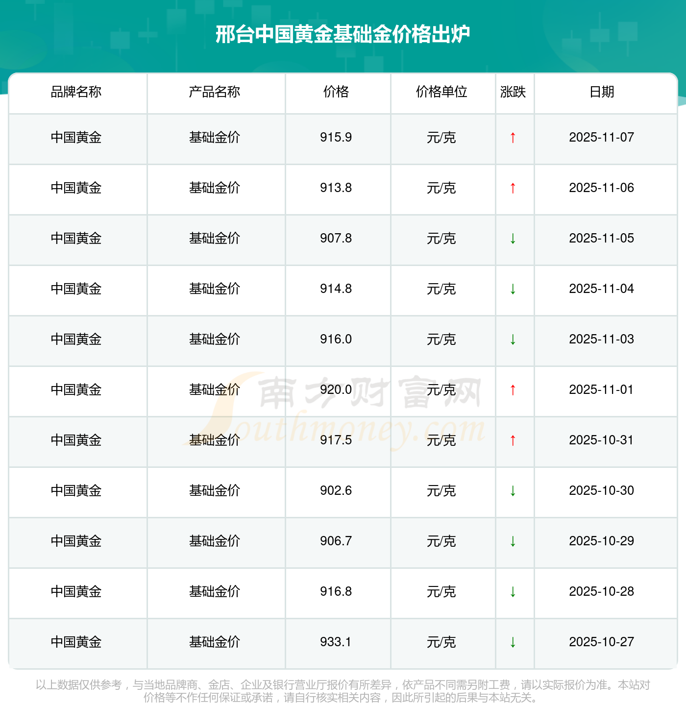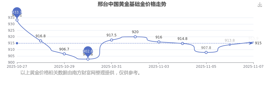 (2025年11月9日)今日邢臺中國黃金基礎(chǔ)金價格是915.9元/克。