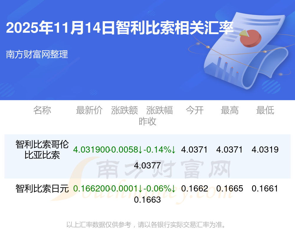 2025年11月14日智利比索兌換日元最新匯率:0.166200,今開:0.1662,昨收:0.1663,最高:0.1665,最低:0.1661。