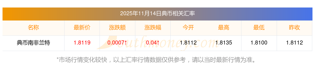 根據(jù)今天2025年11月14日匯率計算,SEK兌換ZAR匯率最新價1.811900,今開價1.8112,昨收價1.8112,最高價1.8135,最低價1.8100。