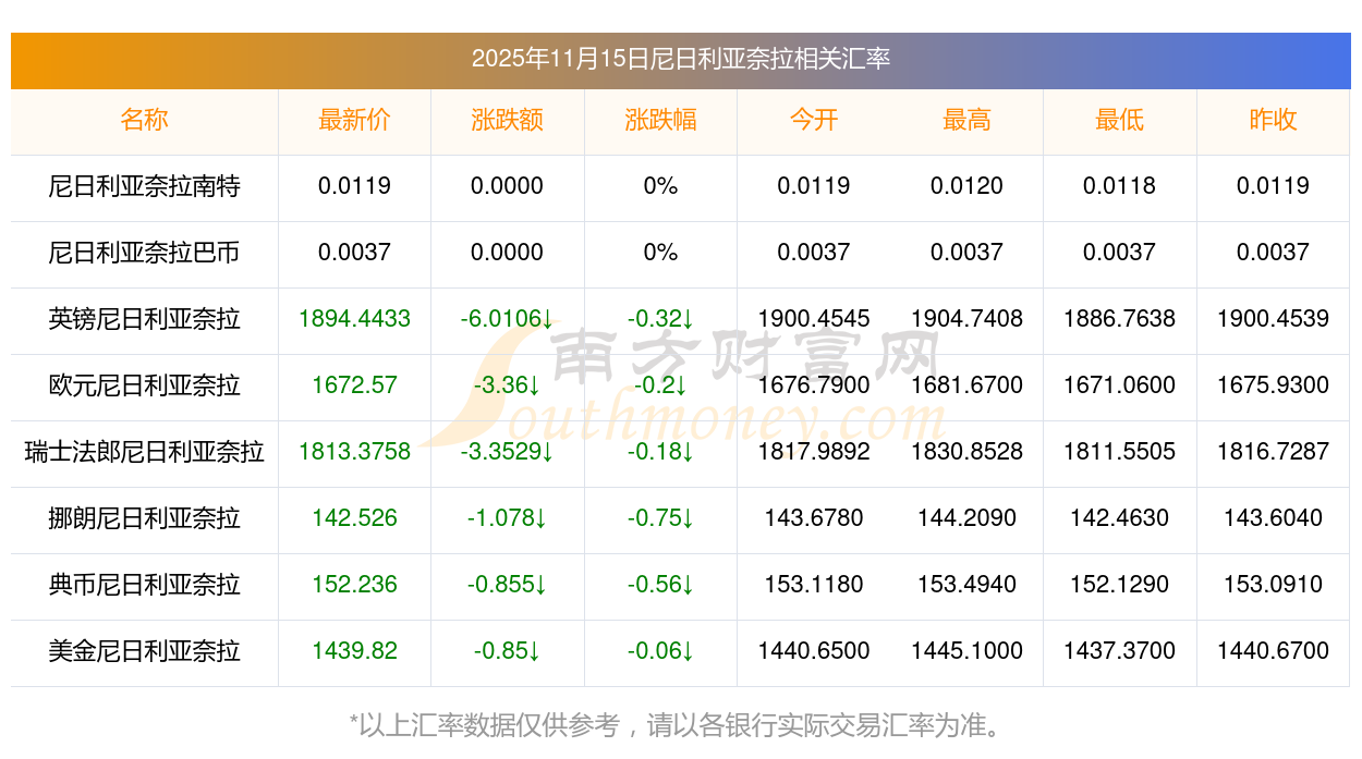 2025年11月15日尼日利亞奈拉相關(guān)匯率查詢