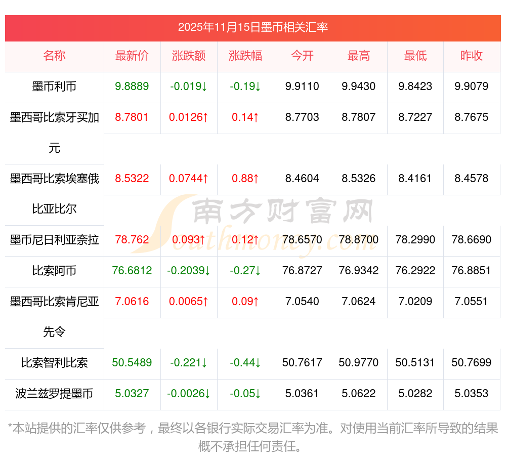 根據(jù)2025年11月15日匯率計(jì)算,墨幣兌換埃鎊匯率最新價(jià)2.576600,今開價(jià)2.5790,昨收價(jià)2.5789,最高價(jià)2.5790,最低價(jià)2.5639。