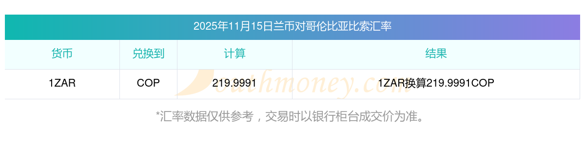 2025年11月15日匯率,換算蘭幣(ZAR)到哥倫比亞比索(COP):1蘭幣等于219.9991哥倫比亞比索
