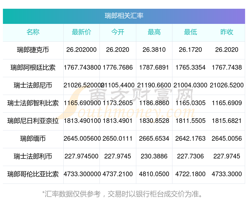 南方財富網(wǎng)為您提供瑞郎對波幣匯率最新價格詳情。