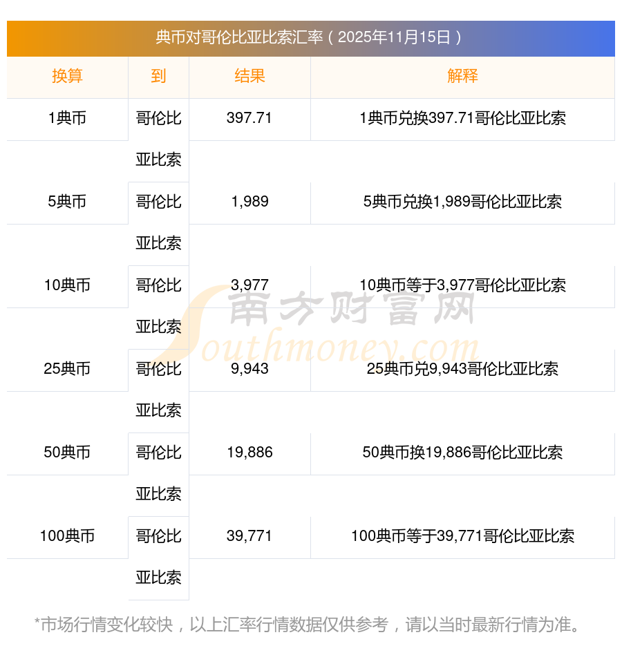 今日典幣匯價:2025年11月15日26典幣兌哥倫比亞比索匯價一覽表