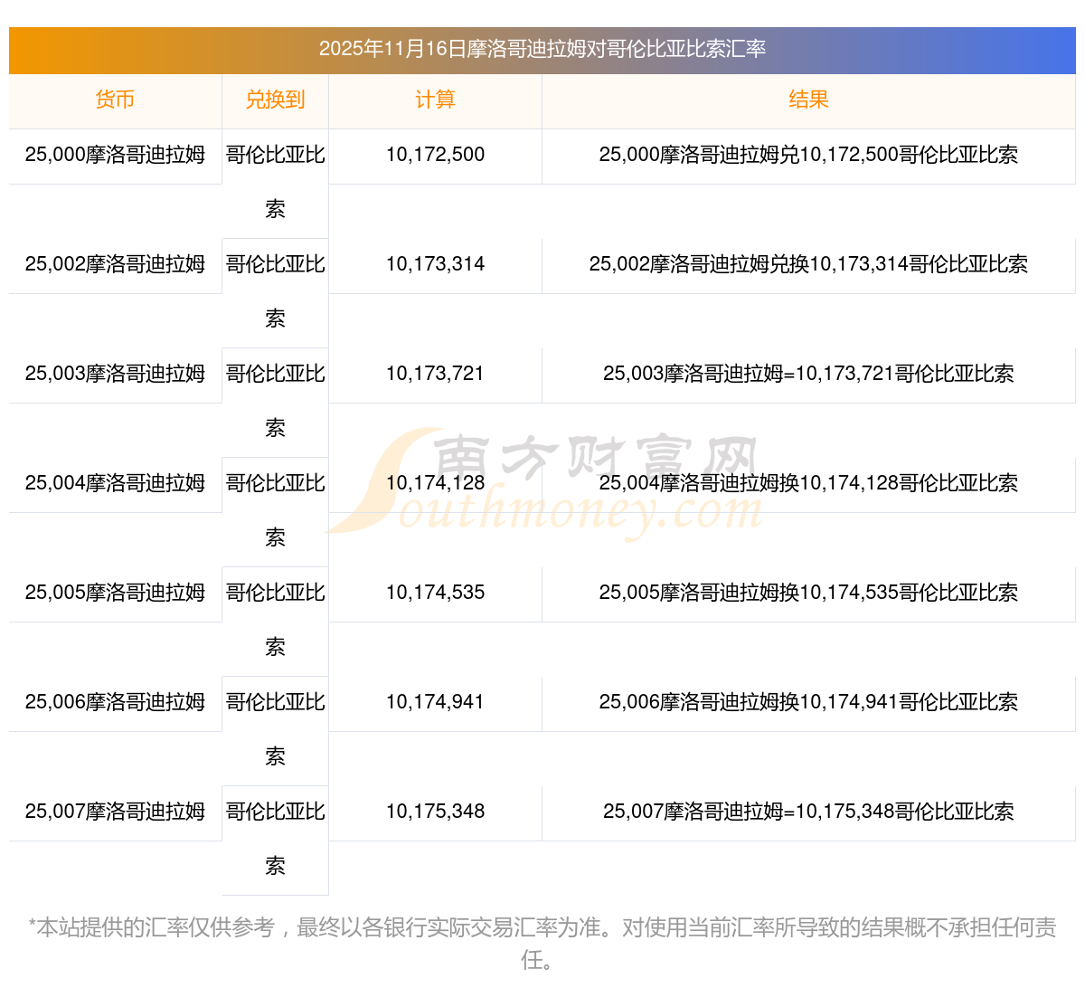 今日2025年11月16日匯率行情:摩洛哥迪拉姆對哥倫比亞比索匯率