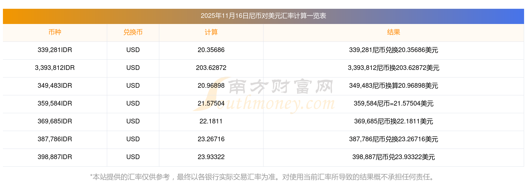 2025年11月16日尼幣對美元的匯率為:6.0E-5