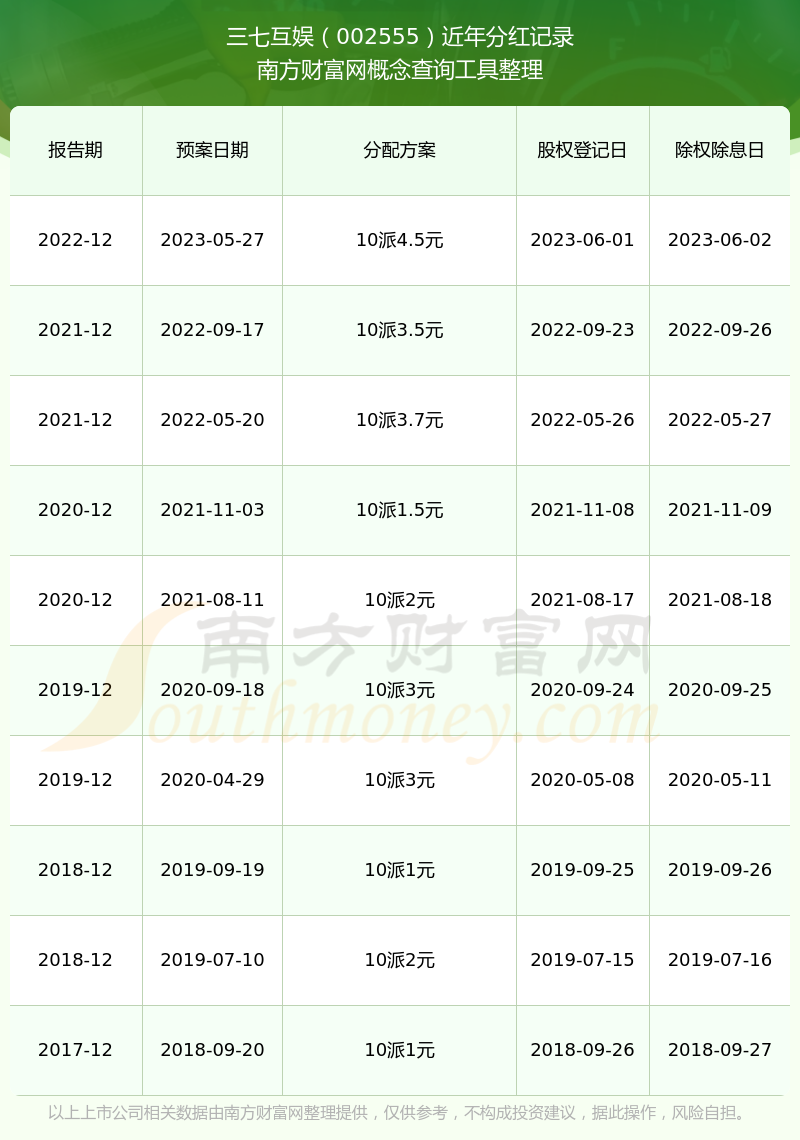 三七互娛最新一次公布的分紅方案為10派4.5元。本次權(quán)益分派股權(quán)登記日為2023年6月1日,除權(quán)除息日為2023年6月2日,派息日為2023年6月2日。