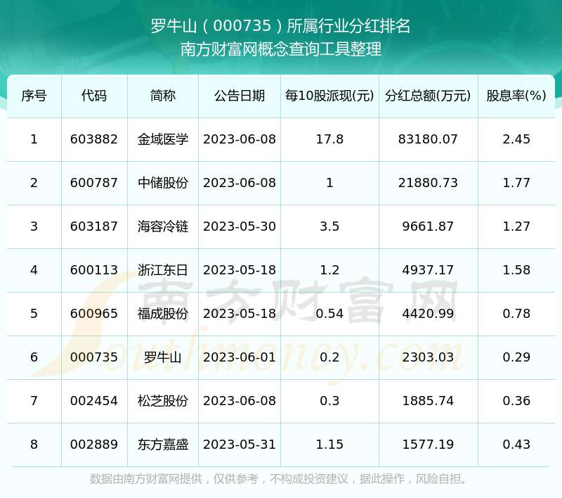 按照南方財富網(wǎng)趨勢選股系統(tǒng)統(tǒng)計,羅牛山所屬行業(yè)為畜牧養(yǎng)殖行業(yè),畜牧養(yǎng)殖行業(yè)分紅排名情況如下表: