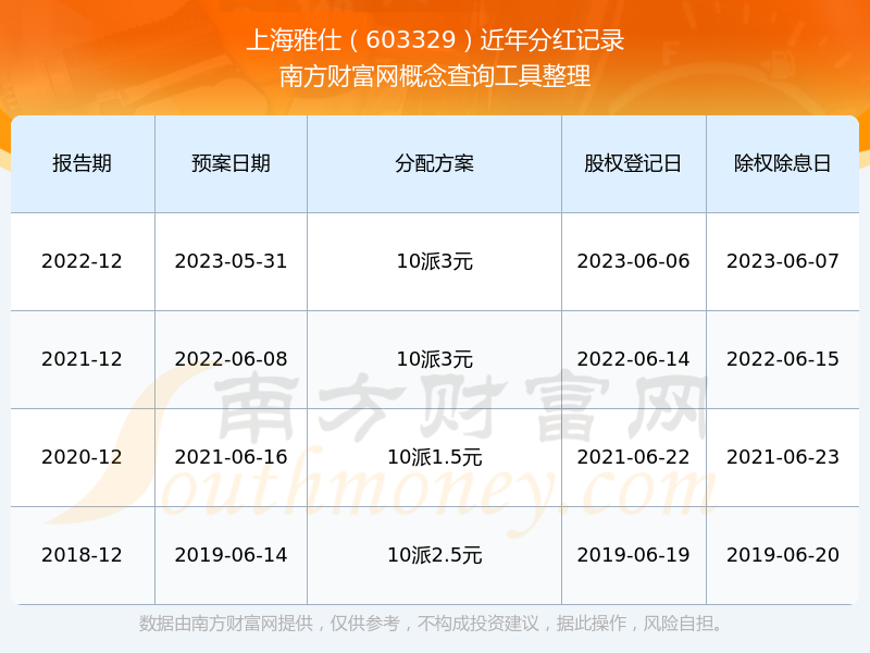 上海雅仕最新一次公布的分紅方案為10派3元。本次權(quán)益分派股權(quán)登記日為2023年6月6日,除權(quán)除息日為2023年6月7日,派息日為2023年6月7日。