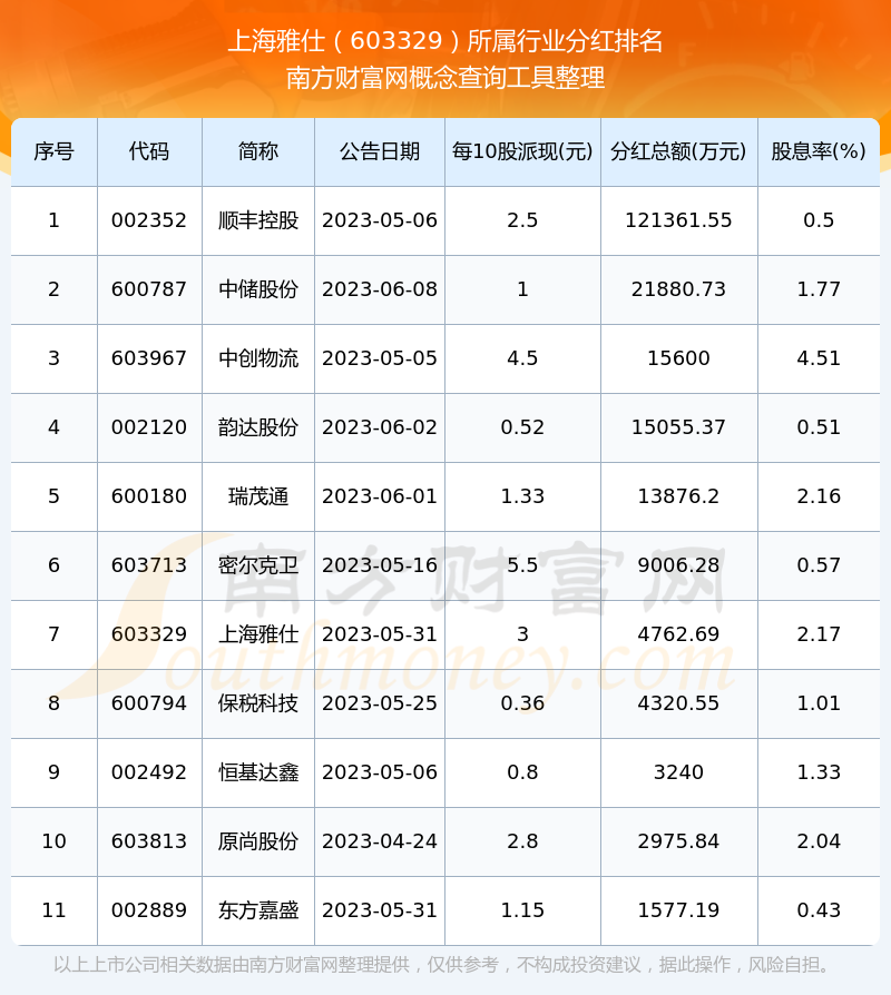 按照南方財富網(wǎng)趨勢選股系統(tǒng)統(tǒng)計,上海雅仕所屬行業(yè)為物流行業(yè)行業(yè),物流行業(yè)行業(yè)分紅排名情況如下表: